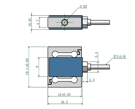 输出灵敏度 1.0/2.0±10%mV/V 零点输出 ±0.05mV/V 蠕变 ≤0.05%F.S. 非线性 ≤0.05%F.S. 滞后 ≤0.05%F.S. 重复性 ≤0.05%F.S. 输入电阻 400/350±5Ω 输出电阻 400/350±5Ω 温度灵敏度漂移 0.05%F.S./10℃ 零点温度漂移 0.05%F.S./10℃ 绝缘电阻 ≥5000MΩ/100V(DC) 激励电压 5~15V 最大激励电压 20V 温度补偿范围 -10~60℃ 工作温度范围 -20~80℃ 安全过载 150%F.S. 极限过载 200%F.S. 电缆线尺寸 φ2X3000mm 产品重量 0.1kg 材料 不锈钢 产品尺寸图