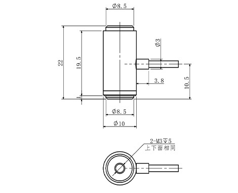 输出灵敏度 2.0±10%mV/V 零点输出 ±0.05%mV/V 蠕变 ≤0.1%F.S. 非线性 ≤0.1%F.S. 滞后 ≤0.1%F.S. 重复性 ≤0.1%F.S. 输入电阻 650/350±5Ω 输出电阻 650/350±5Ω 温度灵敏度漂移 0.05%F.S./10℃ 零点温度漂移 0.05%F.S./10℃ 绝缘电阻 ≥5000MΩ/100V(DC) 激励电压 5V 最大激励电压 15V 温度补偿范围 -10~40℃ 工作温度范围 -20~60℃ 安全过载 150%F.S. 极限过载 200%F.S. 电缆线尺寸 φ2X3000mm 产品重量 0.1kg 材料 不锈钢 产品尺寸图