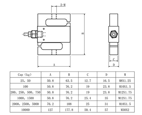 输出灵敏度 2.0/3.0±1%mV/V 零点输出 ±0.03mV/V 蠕变 ≤0.024%F.S. 非线性 ≤0.03%F.S. 滞后 ≤0.03%F.S. 重复性 ≤0.03%F.S. 输入电阻 385±10Ω 输出电阻 350±5Ω 温度灵敏度漂移 0.05%F.S./10℃ 零点温度漂移 0.05%F.S./10℃ 绝缘电阻 ≥5000MΩ/100V(DC) 激励电压 5~15V 最大激励电压 20V 温度补偿范围 -10~40℃ 工作温度范围 -30~70℃ 安全过载 150%F.S. 极限过载 200%F.S. 电缆线尺寸 φ5X3000mm 产品重量 - 材料 合金钢 产品尺寸图