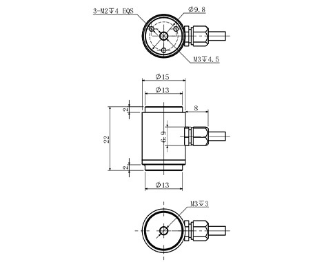 输出灵敏度 2.0±10%mV/V 零点输出 ±0.05%mV/V 蠕变 ≤0.05%F.S. 非线性 ≤0.05%F.S. 滞后 ≤0.05%F.S. 重复性 ≤0.05%F.S. 输入电阻 350±5Ω 输出电阻 350±5Ω 温度灵敏度漂移 0.05%F.S./10℃ 零点温度漂移 0.05%F.S./10℃ 绝缘电阻 ≥5000MΩ/100V(DC) 激励电压 5V 最大激励电压 15V 温度补偿范围 -10~60℃ 工作温度范围 -20~80℃ 安全过载 150%F.S. 极限过载 200%F.S. 电缆线尺寸 φ3X3000mm 产品重量 0.1kg 材料 不锈钢 产品尺寸图
